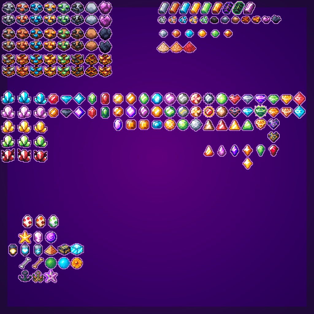 full sprite sheet (all ores, ingots, and gems together. Everything is 16x16 something can be up 32x32) disclaimer white outlines in pictures down below, is just for image style.